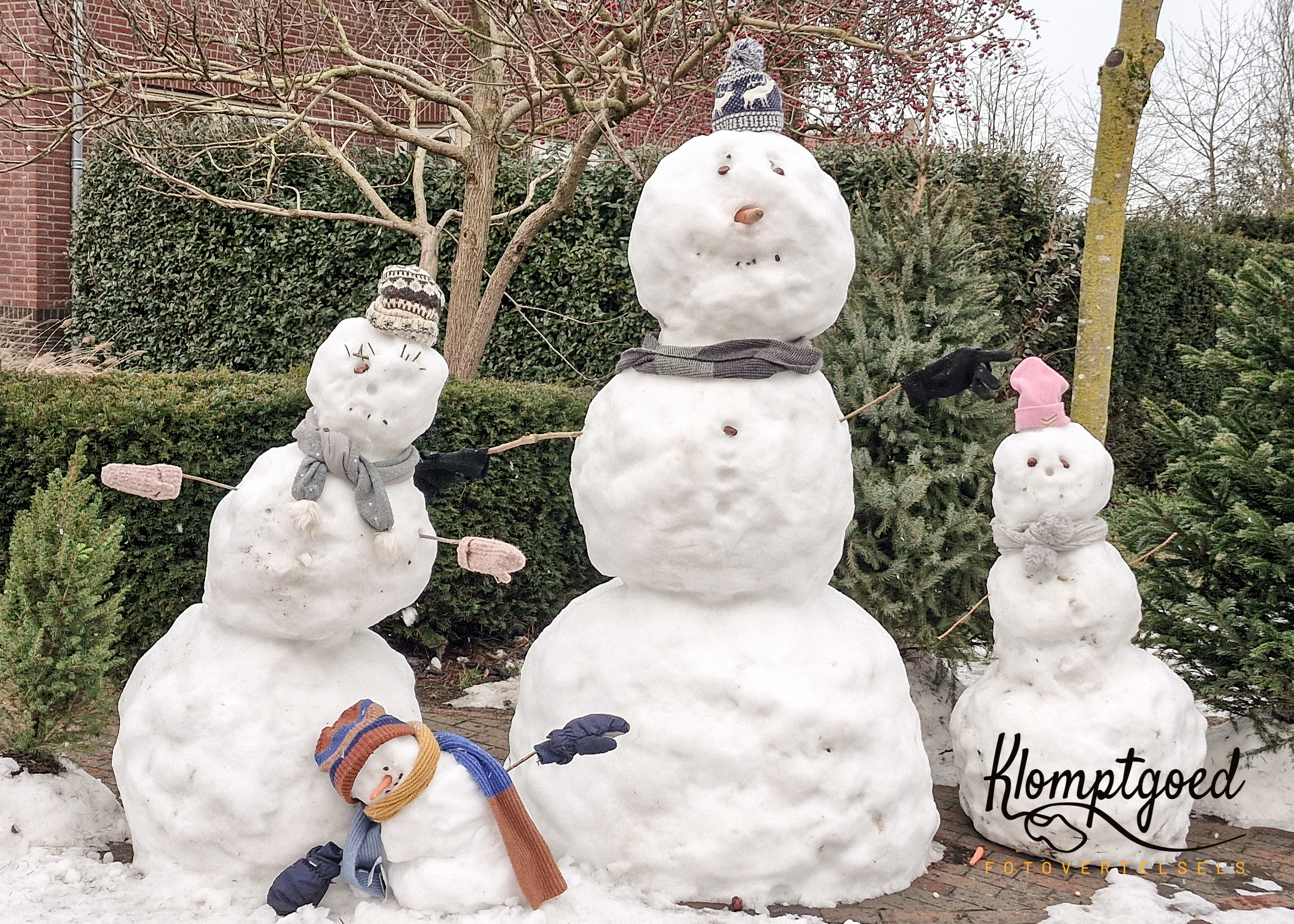 Nabij Varsseveld begon het te sneeuwen. Ik vond het prachtig en liep met een glimlach door de koude buitenlucht. Een tegemoetkomende fietser dacht er duidelijk anders over en keek met een alles behalve vrolijke snoet onder een capuchon vandaan die met รฉรฉn hand diep over de ogen werd getrokken. Bijna bij het eindpunt maakte ik de allerlaatste foto van deze etappe. Van het allermooiste sneeuwpoppengezin dat ik ooit heb gezien! Chapeau voor de makers! Daar wordt een mens toch blij van. Chapeau voor Henk en Ans van Mooi Achterhoek. Want ook van deze prachtige wandeletappes wordt ik ontzettend blij. Ik kijk uit naar de volgende. Dan weer verder waar ik was gebleven.